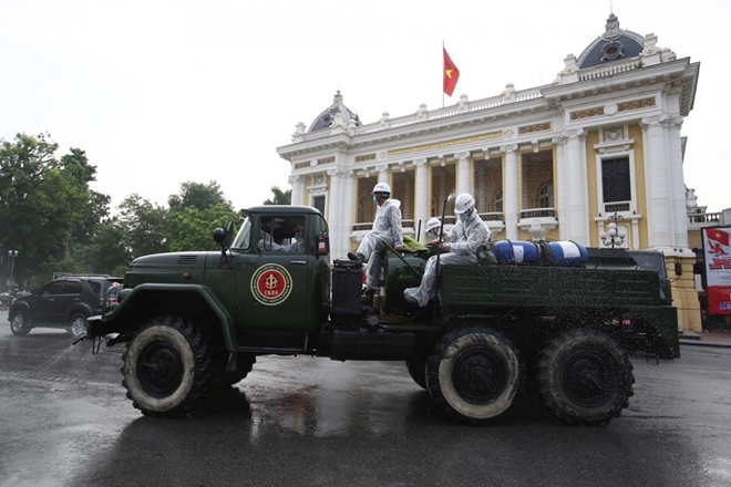 Hundreds of soldiers donning full-protective gear are deployed at various places throughout Hanoi to undertake the task. |