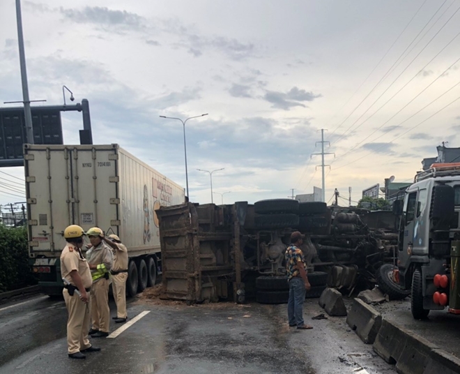 While running past the 5/2 section of Highway No.1, the truck suddenly crashed into the road divider and turned over. After the accident, the driver was slightly injured but the truck was seriously damaged.